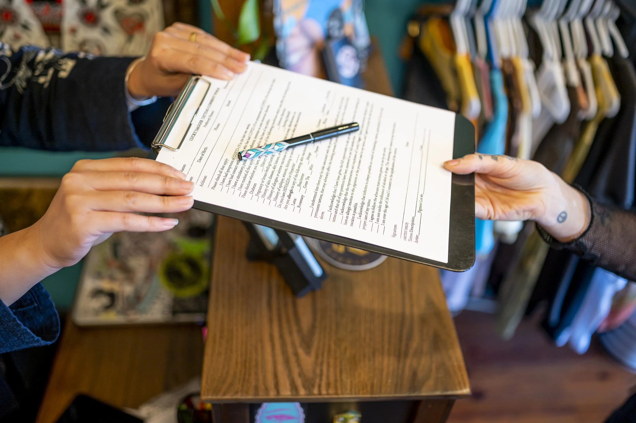 Wear clothing that is loose fitting around the part of your body you are getting tattooed. We have privacy screens for parts of the body that require more clothing removal. We keep the temperature at 70F so if you get cold easily, bring a jacket or wear pants if possible.