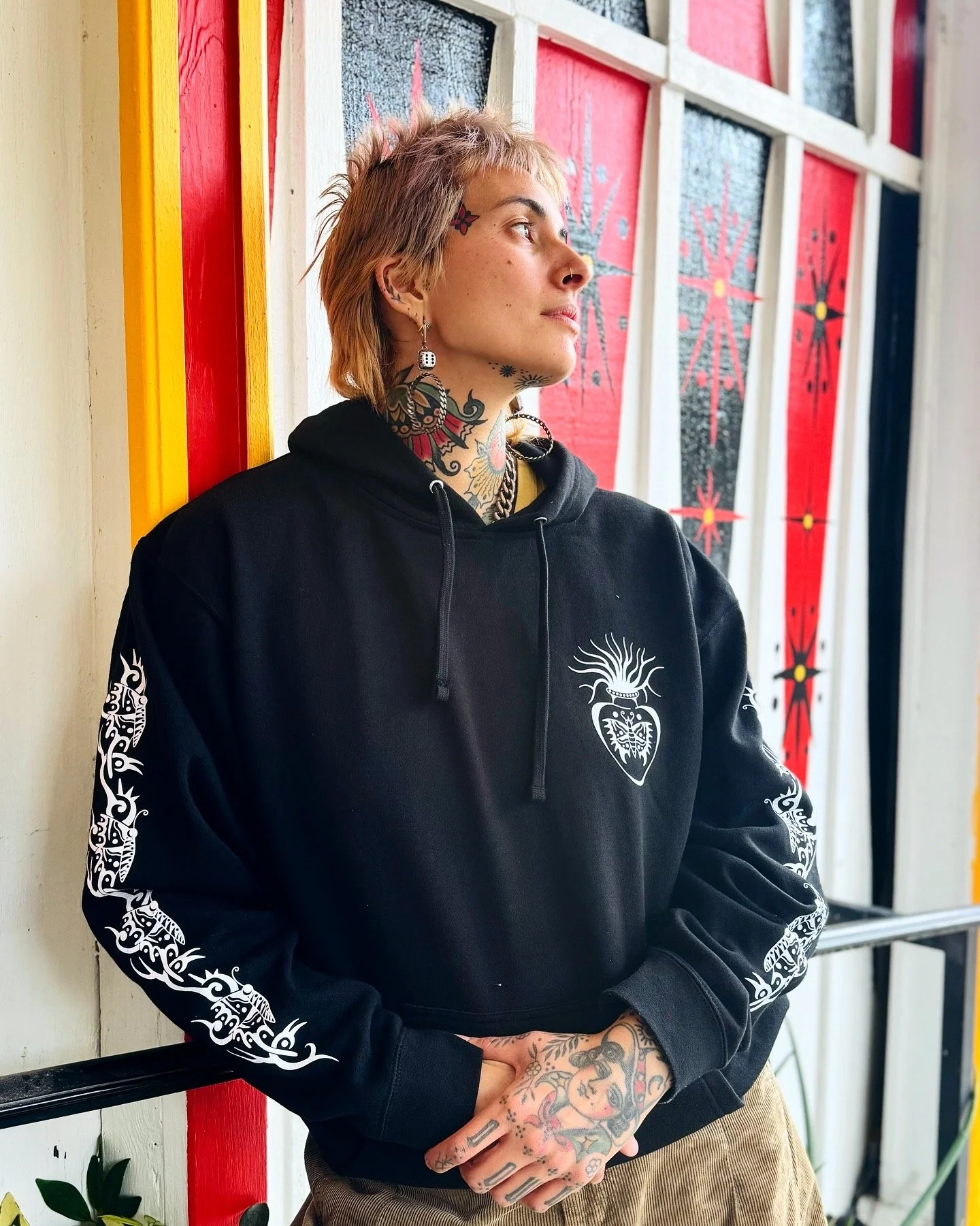 We just got some hot new merch in!! We have Mardi Gras Vintage Inspired T-Shirts (pictured here in teal and pink, we will also have a classic Mardi Gras Color pallet available). We also have the new Sacred Heart hoodies, the design is the front and back as well as the detailed sleeves. Super cool. The Shirts are $25 in store $30 shipped, hoodies are $45 in store, $50 shipped.