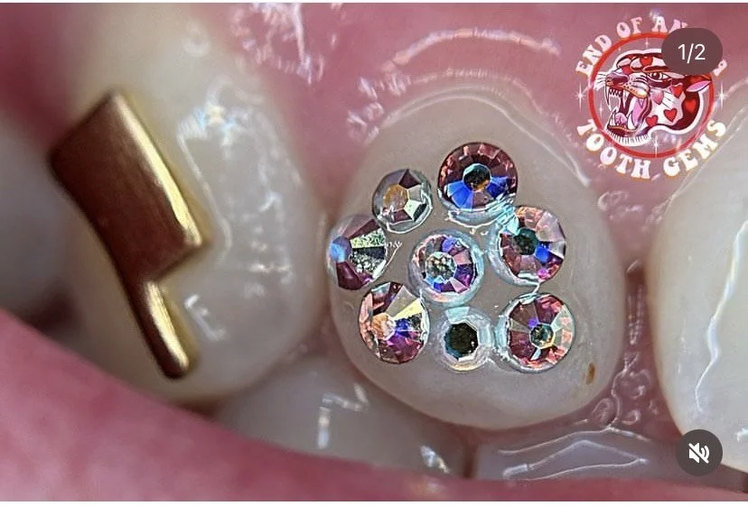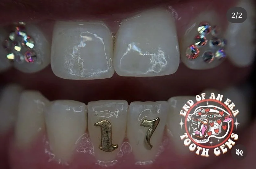 Looking for some serious bling on your mouth? While a gem or two can be a cute accessory, a more detailed plan of gems can really add some sparkle to your smile. Era, our resident tooth gem artist offers bigger packages to those who want to design something bigger! Come stop by the shop or hit them up on instagram to inquire. Check out what juggalo magic they just made on our Counter person, Emily! whoop whoop!!